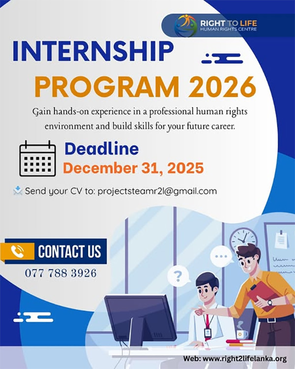 Right to Life Human Rights Center is a non-profit organization working for a torture-free, human rights-assured, peaceful and democratic Sri Lanka. For this, the organization leads advocacy campaigns mainly through grassroots networks such as Human Rights First Aid Centers, Sri Lanka Collective Against Torture, Journalists for Rights and Lawyers for Rights. We study the issues, report with evidence and communicate them via our media channels targeting the general public as well as policymakers. Also, Right to Life Human Rights Centre tests practical actions with people to solve their problems.